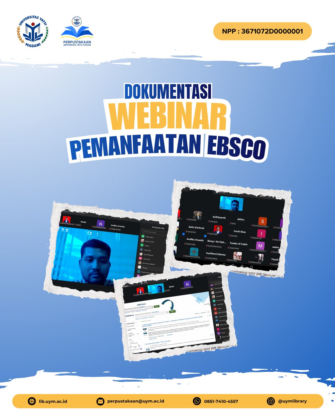 Webinar ini bertujuan untuk memberikan pemahaman mendalam bagi seluruh sivitas akademika mengenai optimalisasi fitur-fitur yang tersedia dalam database EBSCO. Diharapkan melalui sosialisasi ini, akses terhadap literatur ilmiah bereputasi dapat dimanfaatkan secara maksimal untuk mendukung kualitas riset dan tugas akhir.
